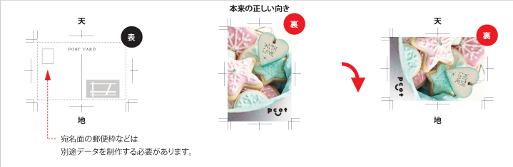 データが横向きの場合、特別な指示が無い限り、宛名面を基準としてデータを右回り(時計回り)に90度回転させて印刷します。